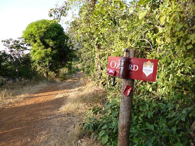 A long day turns into night (Part 2)5:15pm I'm greeting a toothless grandma: „Jarama“, she's greeting back „Jarama“. A bit off the road one can see a few small, poor looking huts. 5:26pm Cigarette advertising sign? Cigarette advertising sign. What would this world be without cigarette advertisement. After that I pass through a couple of villages, I ask if I'm still on the right track. 6:02pm The road ends at a gate, behind it there's a village. A gated comunity? What shall I do? A man who happens to pass by gives me an explanation that I don't understand - and opens the gate for me. He knows that on my way to the border I will have to cross a river and later on will have to turn left at a junction. 6:24pm For the last time today I can read my speedometer: still 4 kilometers to go until Mali. It gets dark, really dark. There's an omnivorous blackness, not even the moon is shining. The starry sky is magnificent, but I have no eye for it. When I'm pushing my bike through a grove I hear a suspicious noise behind me. I turn around, a black shadow is creeping onto the path. A damn huge pussy-cat. A too big cat. Green eyes are lurking in the darkness. Their flashing look doesn't inspire my confidence and the cat seems to get bigger and bigger. I yell in a terrifying way and slap my palm on the saddle. Whatever it is, it is scared and flees back into the wood. From now on I'm even more on the alert while pushing my bike. There's nowhere a light to be seen. I should have already seen any lights shining over from Mali. Instead of that the road is still a grim up and down. Being on the bike again I'm crossing a small creek. Afterwards the chain drive grinds severely. In the darkness I cannot figure out the cause and knock against the mudguard. Gravel crumbles off, but the awkward grind doesn't disappear again. With my headlamp switched on I check the speedometer. I've already covered more than 8 kilometers since I've left the village. And there's still nothing else than darkness and scree. In the meantime I don't feel strong enough anymore to curse. I'm asking everybody who comes along for Mali. Just keep going on. „C'est loin?““Pas loin““Mais c'est loin“. Some time later somebody says it would only be 2 more kilometers until Mali. Because lots of boulders and scree I have stopped cycling for quite a while. I can hardly see the road anymore. It seems to get wider and wider, 50 meters, 100 meters, a gigantic area of scree. A moonscape, but even the moon is hiding. Am I still on track? The only help for orientation provides the dimmed light of my electric torches. But where are the bright lights of Mali? On and on I'm dragging myself across the scree. There's simply no alternative. Then I discover a couple of lights that are not far away anymore. Unnoticed I have reached a hilltop and now can see the first glimmer of light of my destination. This eventually is the end of the by far hardest day of my journey.