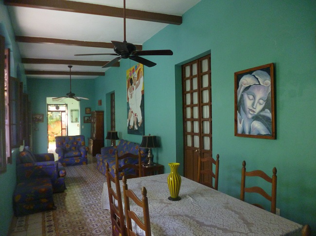 Nachdem wir in mehreren auch größeren Hotels kein freies Zimmer mehr finden konnten, hatte ich bei einem kleinen feinen B & B wenig Hoffnung, etwas zu bekommen. Ein Hund begrüßte uns Fremde statt mit einem warnenden Bellen mit freudig erregtem Gehoppse. Ein Mexicaner und der Eigentümer der Casa Santiago, Frank, ein pensionierter amerikanicher Anwalt, waren nicht wenig überrascht, dass jemand an der Tür läutete und nach einem Zimmer fragte. Auch gehörten wir mit unseren Rucksäcken und einem abgefuckten Backpacker-Look nicht gerade zu der Zielgruppe dieses gehobenen Etablissements. Wir wurden gefragt, wie es uns denn einfallen könne, zu diesem Zeitpunkt ohne Reservierung aufzutauchen. Und doch bekamen wir ein Zimmer. Das B & B im historischen Zentrum von Merida umfasst mehrere sehr stilvoll restaurierte Kolonialgebäude mit einem prächtigen tropischen Garten und einem mit Mosaikfliesen künstlerisch gestalteten Pool. Die Zimmer sind alle individuell designed und mit jeder Menge Kunst dekoriert. Am Abend auf Franks Sylvesterparty wurden wir den anderen Gästen, amerikanische und mexicanische Intelektuelle, Bohemiens und Journalisten, mit folgende Worten vorgestellt: "These are two German vagabunds, who are pretending they are an engineer and a doctor."